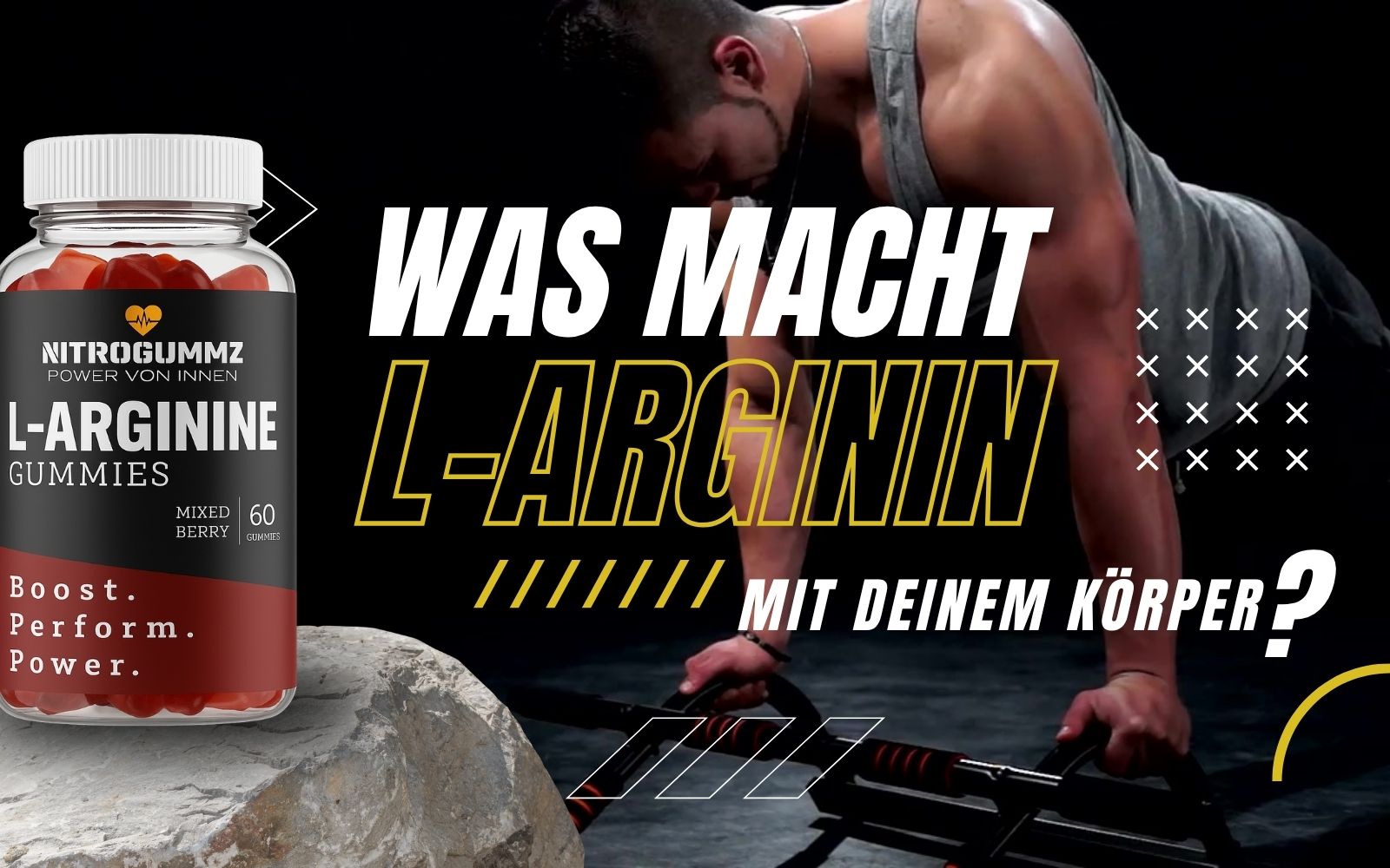Unsere veganen, glutenfreien und zuckerfreien NitroGummz liefern hochdosiertes L-Arginin pro Portion, unterstützen die Durchblutung, Leistungsfähigkeit und Ausdauer und enthalten nur reine, wirksame Inhaltsstoffe. Dank ihrer optimalen Aufnahme und der einfachen Dosierung sind sie perfekt für unterwegs und helfen dir, deine Energie, Regeneration und Performance auf das nächste Level zu bringen.